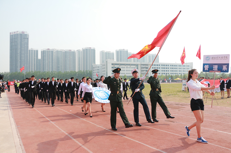 上午八点,运动会正式开幕,各系学生方阵和教职工方队有序入场,方阵造型多样、各具特色,昂首阔步走过主席台接受检阅。庄重的升旗仪式过后,党委书记、院体育运动委员会主任李相然致开幕词,李书记表示本次春季运动会是我院阳光体育系列活动的后续,充分展示我院在体育运动建设方面的成效,他希望运动员们能够积极参与、顽强拼搏,展现出我院师生饱满的精神风貌和高昂的竞技状态。院长于光辉宣布运动会正式开幕。裁判员代表和运动员代表进行庄严宣誓,承诺将恪守体育道德,尊重比赛对手,本着“友谊第一,比赛第二”的原则完成比赛。